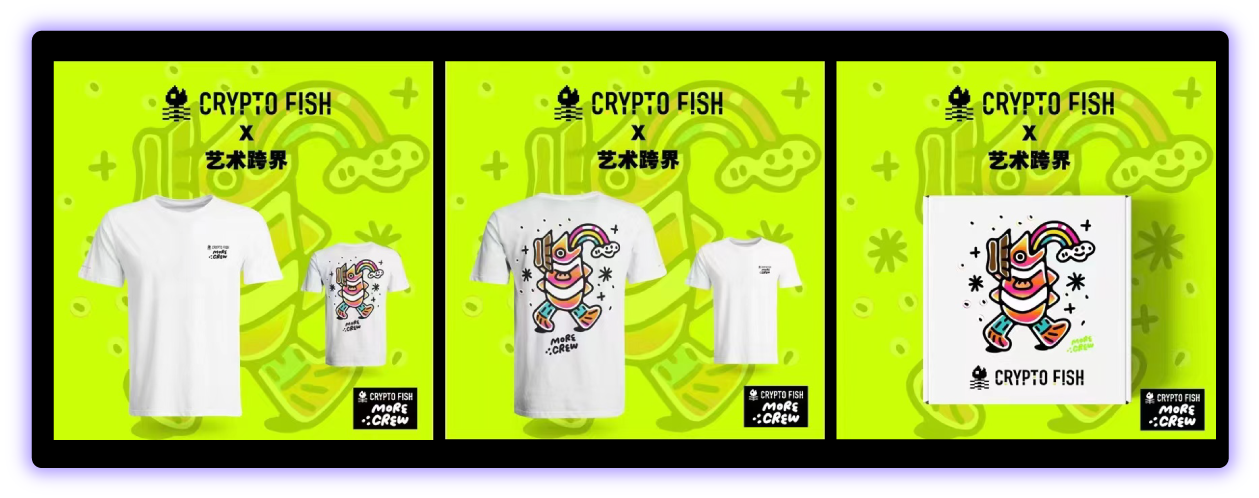 与知名艺术家More毛裤合作的加密咸鱼联名款专属T恤,持有咸鱼的用户可免费铸造。